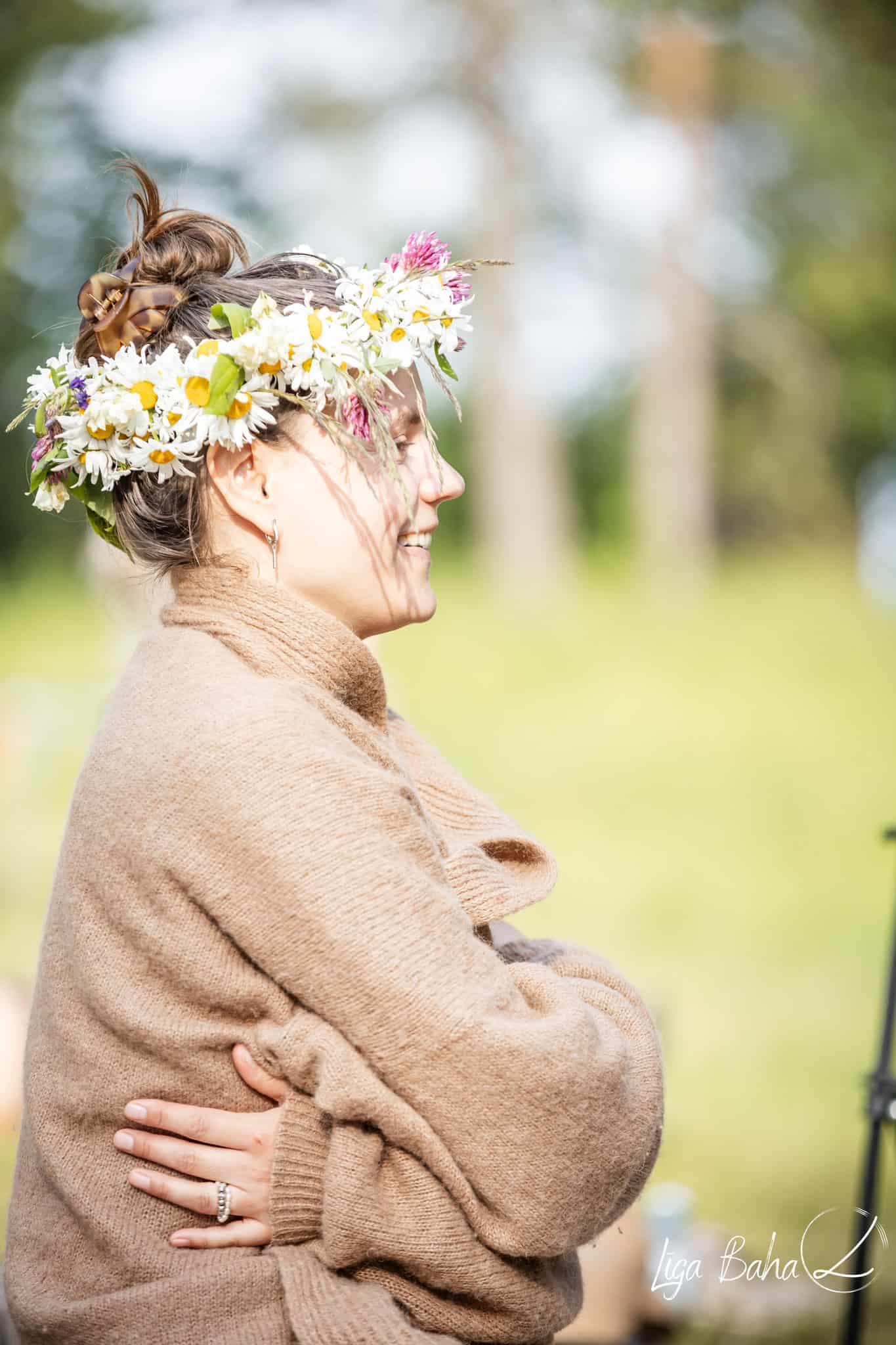 Festivāla dalībnieki ar tradicionālajiem ziedu vainagiem.